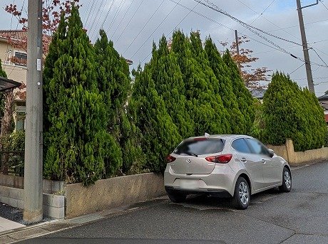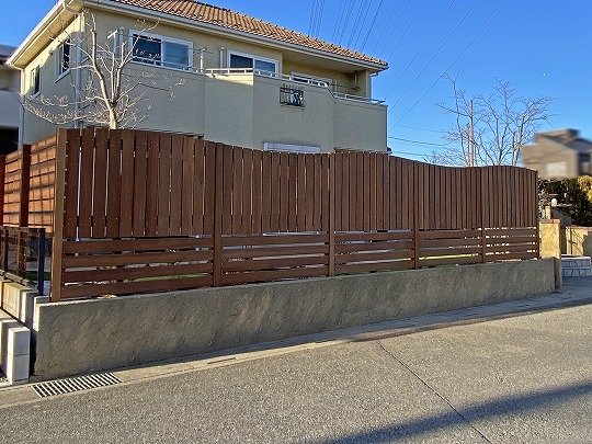 鬱蒼として暗い雰囲気に感じる生垣のエレガンテシマは伐採し、曲線を描いたウリン材のフェンスに😊