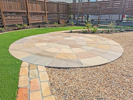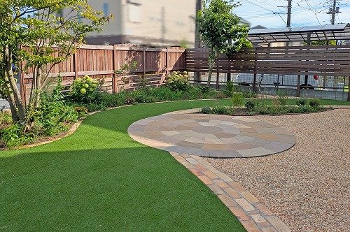 真ん中に直径3mの大きなサークルをつくり、玄関アプローチとサイドガーデンを繋ぐのは緩やかなカーブを描いたアンティークレンガの小道に♪