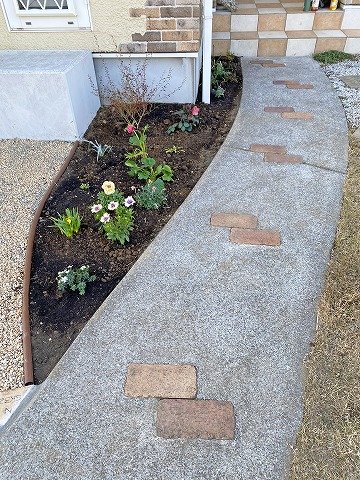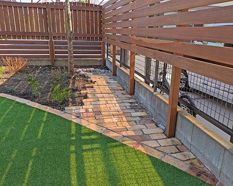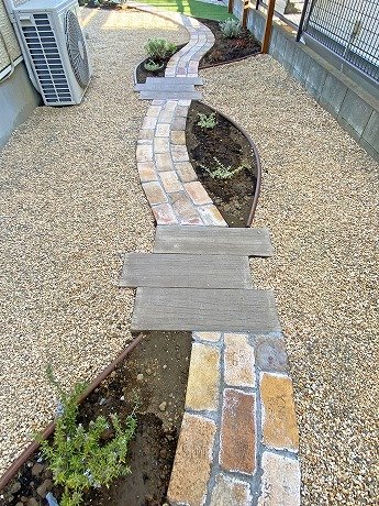 家のサイドもアンティークレンガの小道と植栽でナチュラルテイストに仕上げています👍
